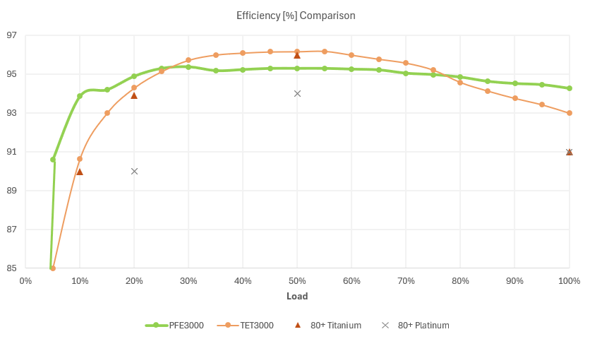 The efficiency curves also highlight the differences between Platinum and Titanium power supplies. Data centers striving to achieve the highest levels of efficiency will be tempted to specify Titanium power supplies. However, it’s useful to evaluate the efficiency curves in light of your expected requirements before making a final decision. While Titanium power supplies provide efficiency improvements at certain points of the curve, the efficiency of Platinum power supplies may provide improvements at other points, such as light and full loading. Comparing the performance of each at the points on the curve you plan to operate can help guide decisions around whether the additional cost of a Titanium power supply is warranted by the efficiency gains that will be realized.